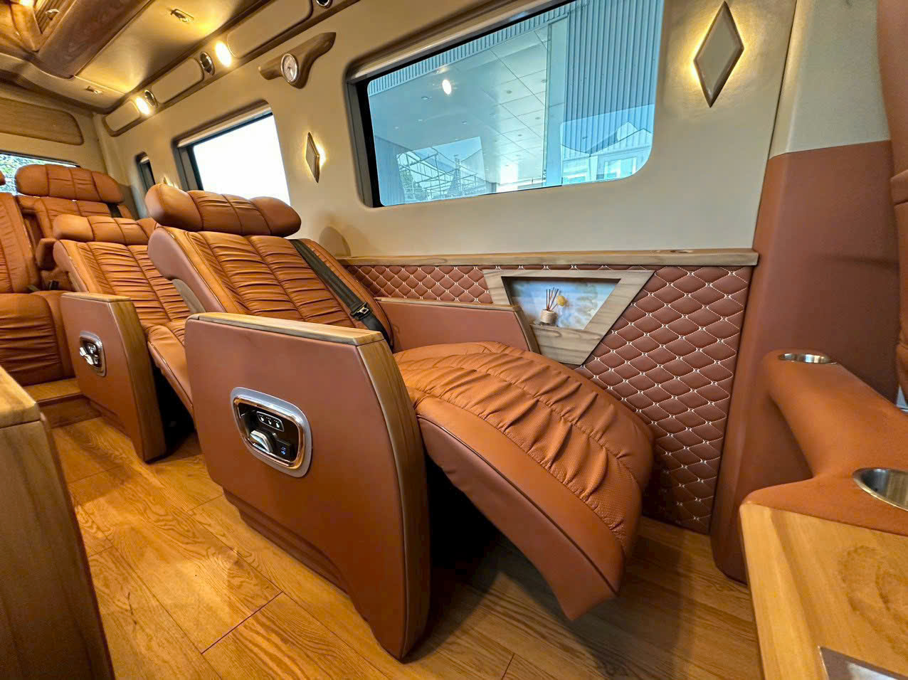 • Ghế Ngả Sâu Tận Dụng Thời Gian: Ghế da cao cấp, có chức năng massage và ngả sâu giúp Lãnh đạo có thể chợp mắt hoặc thư giãn, phục hồi sức khỏe ngay trên xe. Sẵn sàng cho công việc tại KCN Bến Tre.